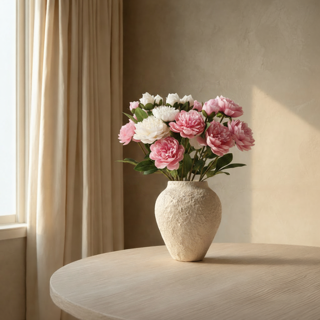 Skap en rolig og sofistikert atmosfære med denne elegante pionbuketten i myke rosa og hvite toner. De fyldige blomstene gir et eksklusivt uttrykk, inspirert av ekte pioner i full blomstring – uten behov for vedlikehold.